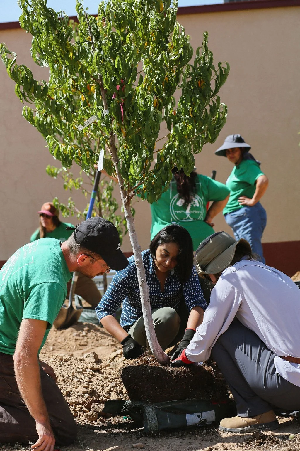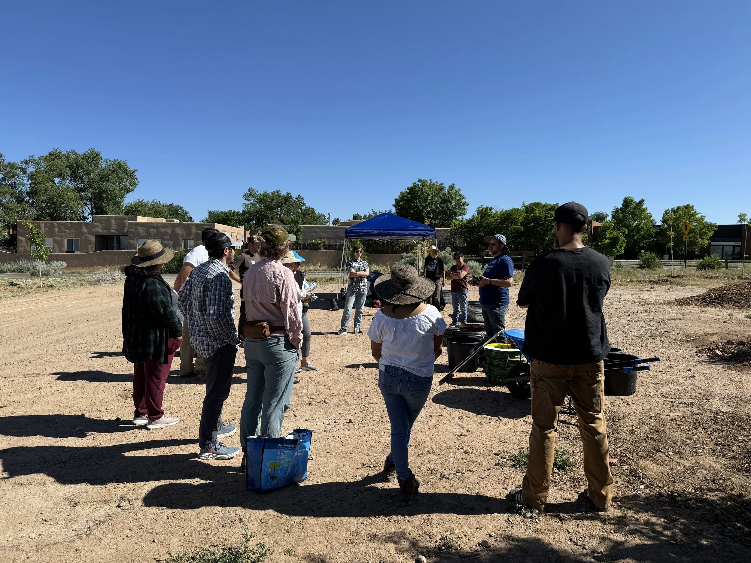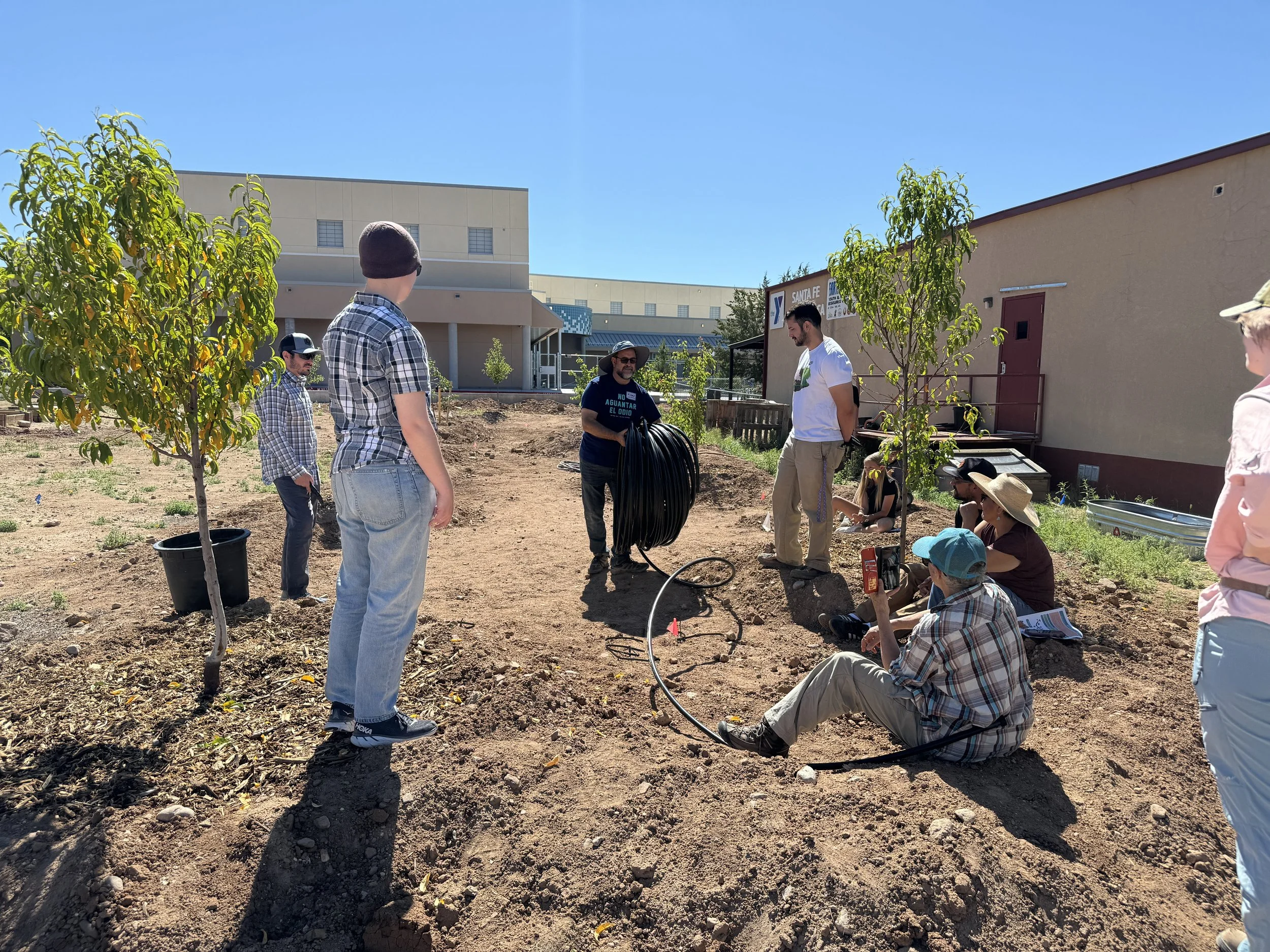 In partnership with Tree New Mexico and Earth Care, Anthropopulus facilitated participatory design and installation of 38 trees, 40 shrubs, and a drip irrigation system at Earth Care New Mexico’s new La Milpa Campus in Santa Fe. Tree New Mexico and Earth Care staff, along with community members, participated in design workshops and hands-on installation. Trees planted include fruit trees and climate-ready tree species, allowing the campus to serve as a learning lab and demonstration garden for the community. Educational materials Anthropopulus previously developed for Bernalillo County Tree Irrigation Workshops were provided to all participants as training materials and a resource to take home.