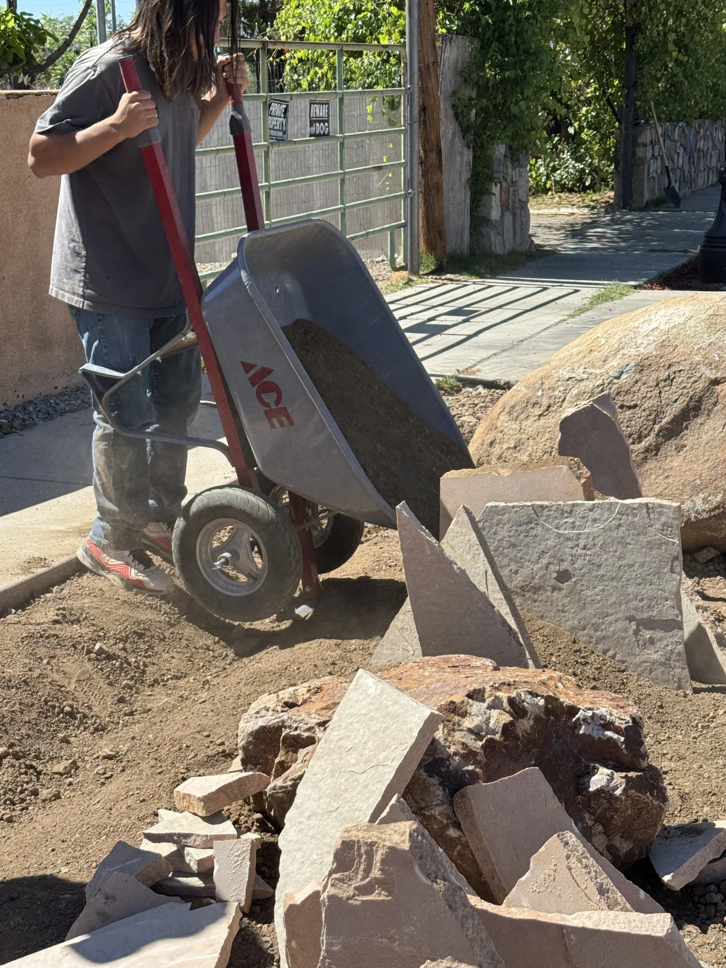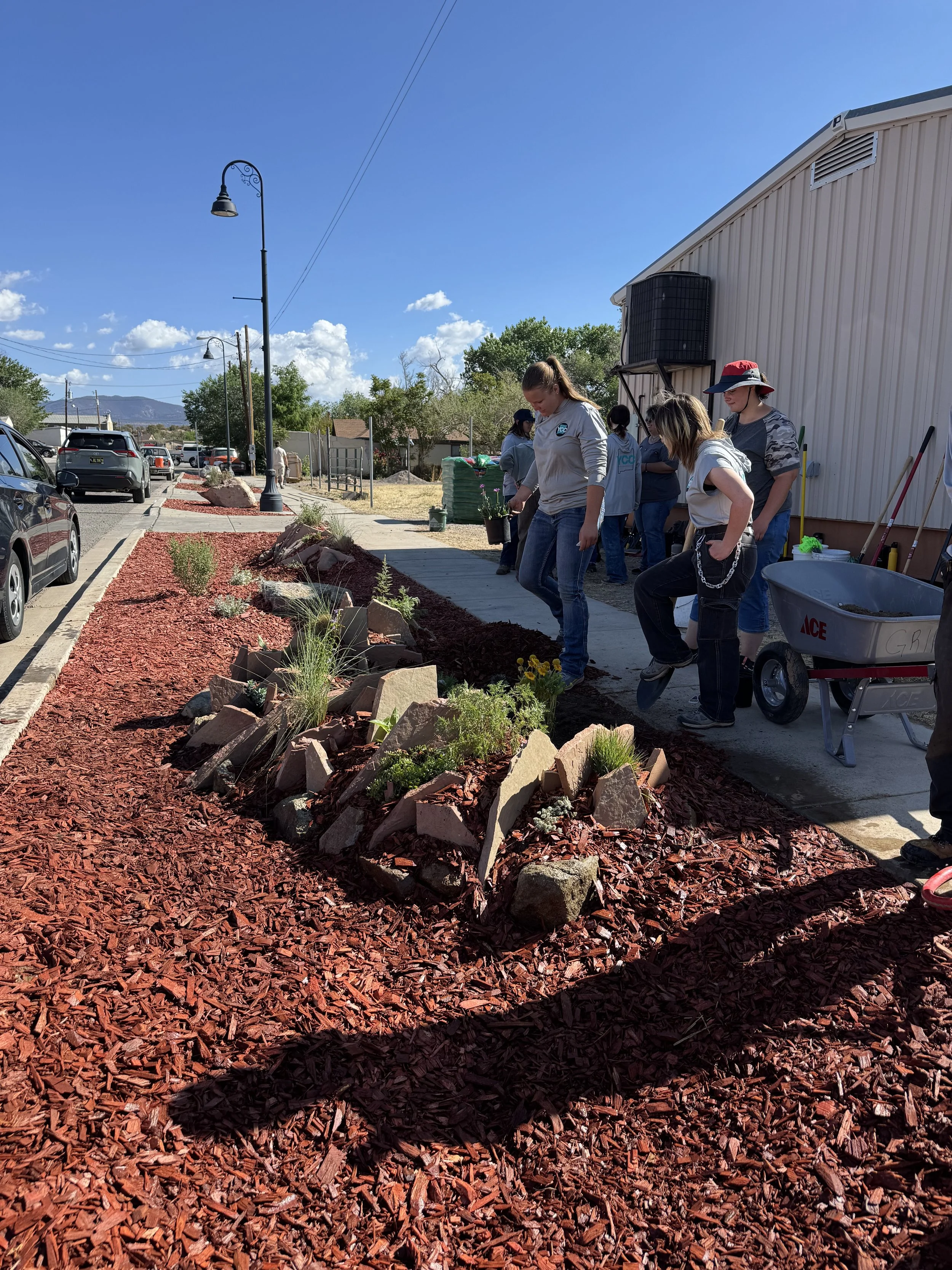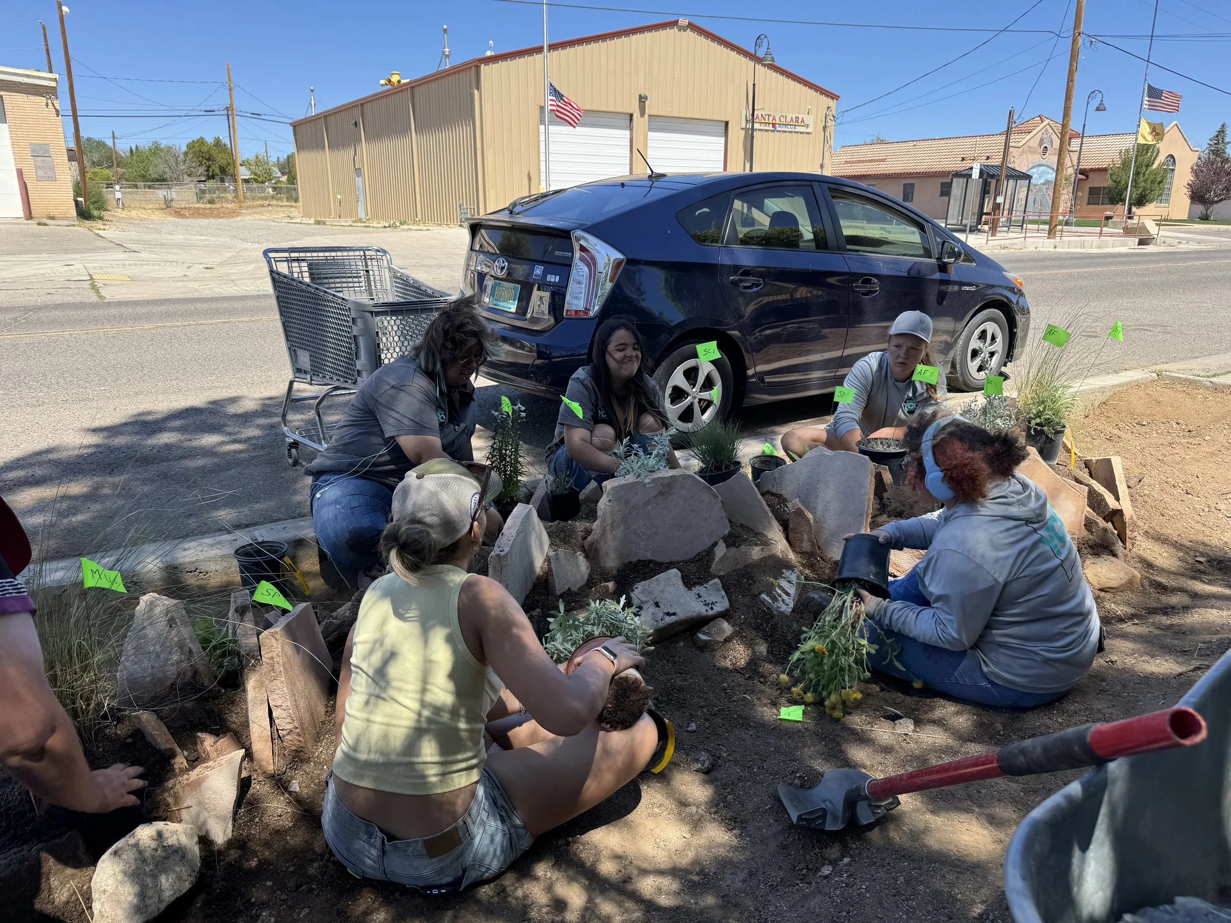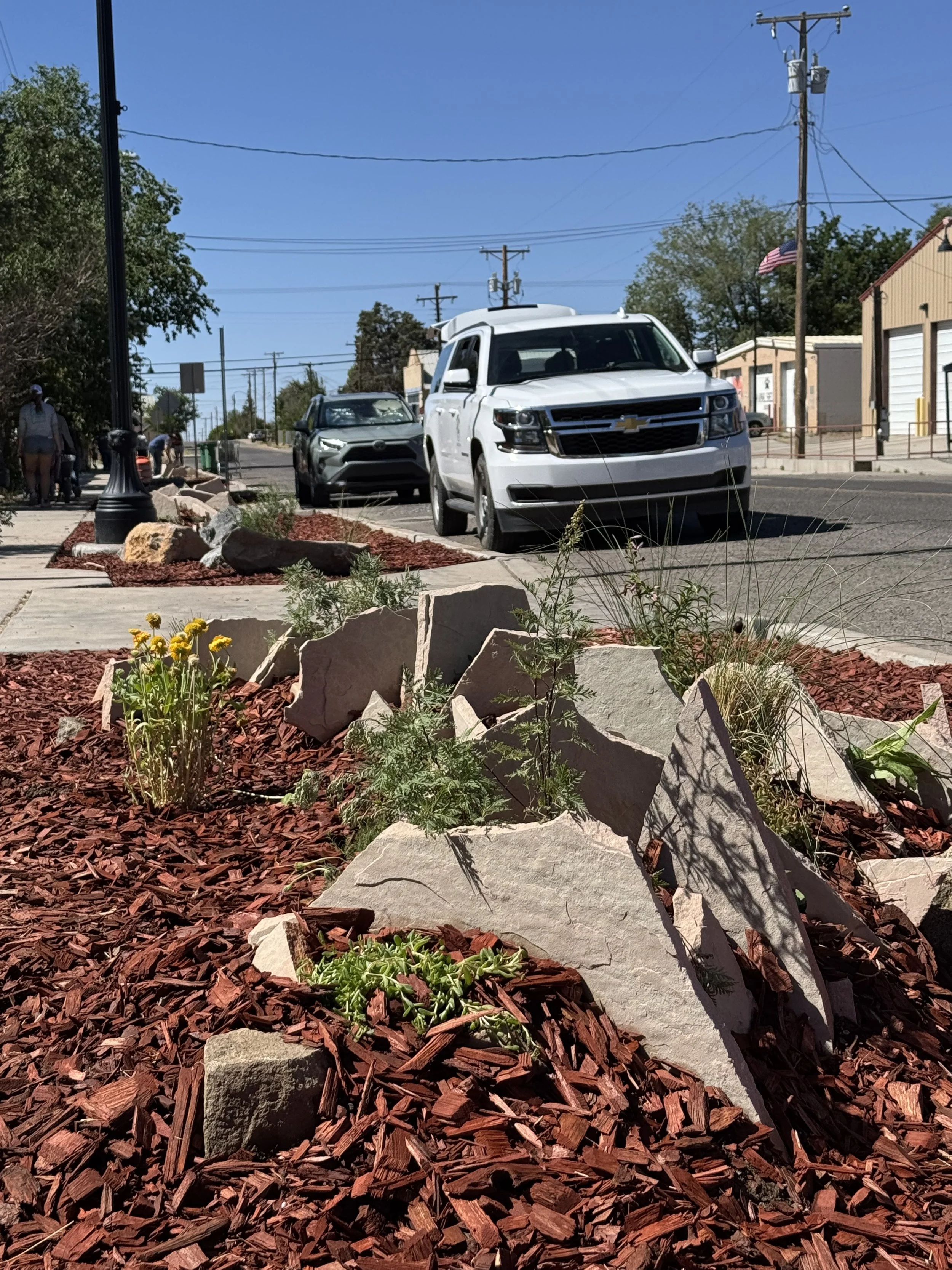 In partnership with the Southwest Community Forestry Network (SWCFN), Anthropopulus developed designs for landscape parkways along Fort Bayard Road in Santa Clara, NM. Due to a shallow gas line, the typical green stormwater infrastructure installation of curb cuts and swales wasn’t feasible in this location. The team applied Kenton Seth and Paul Sprigg’s concept of a crevice garden to the parkways. Crevice gardens mimic the environment of rocky outcroppings by placing flagstone vertically on its side, and filling the spaces in between with a sandy soil, creating small cracks and basins for water to collect and plants to thrive. Community members and SWCFN volunteers installed the crevice gardens in the summer of 2025.