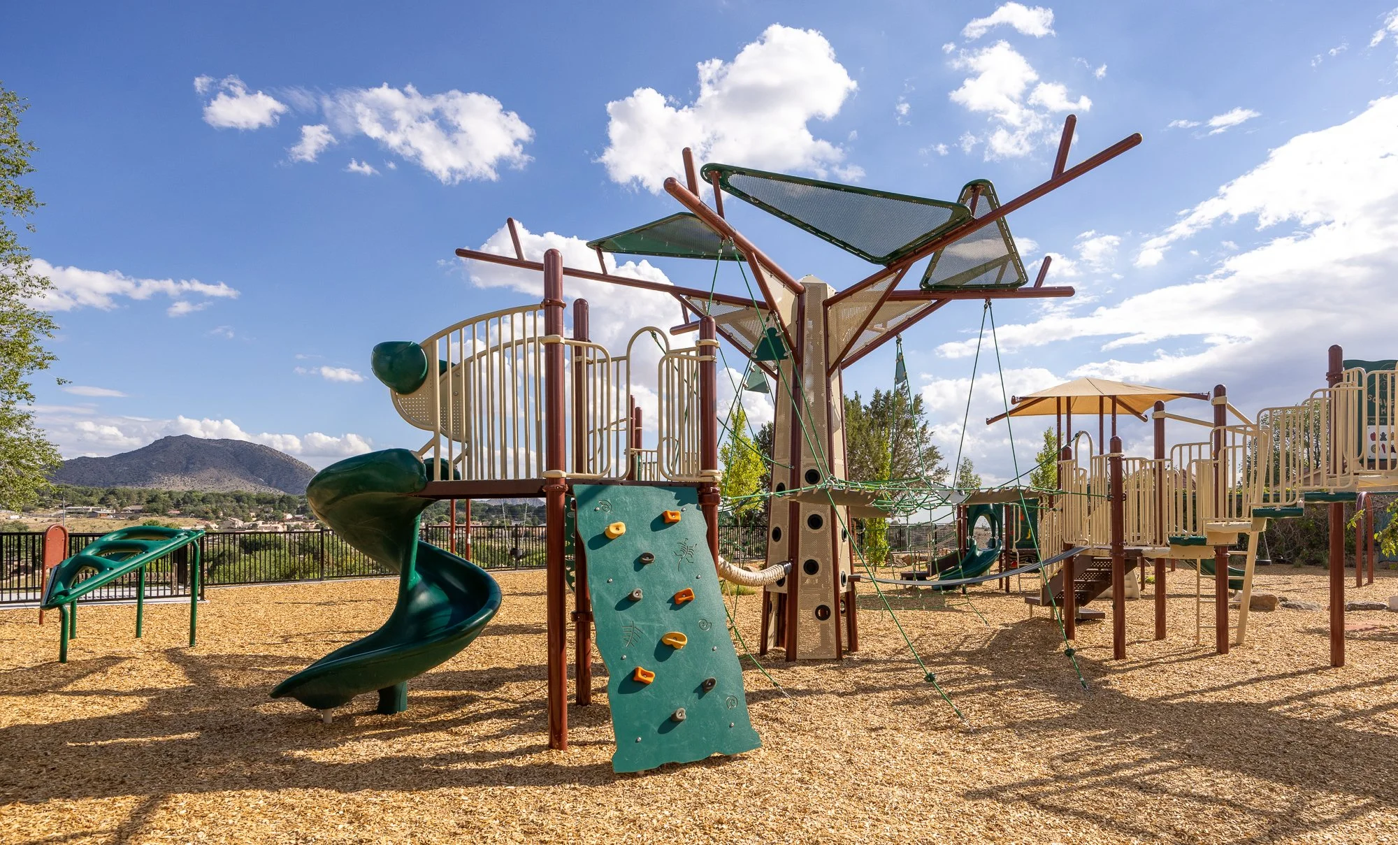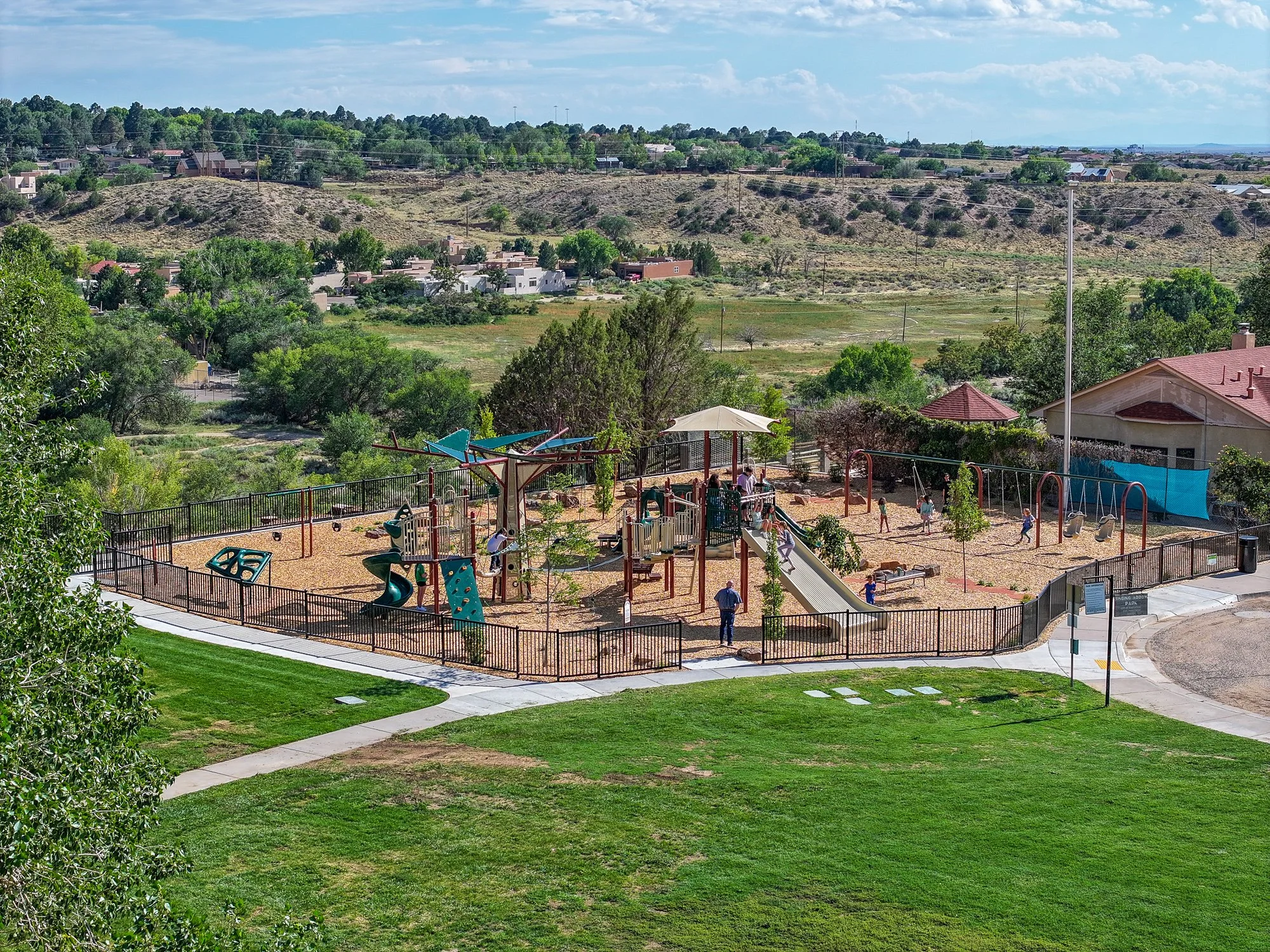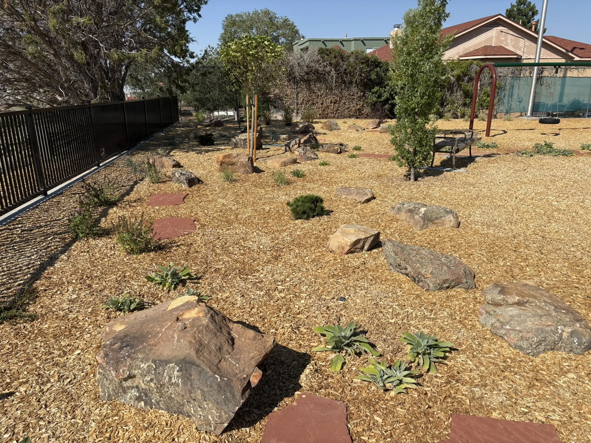 The renovation of the Singing Arrow Park play area was completed as part of the City of Albuquerque’s initiative to restore playgrounds citywide. Anthropopulus collaborated with partners at the Parks & Recreation Department to design a play area that provides an inclusive play environment and opportunities for engagement with natural materials. Soft plants were selected with curious fingers in mind, as were special trees that will provide shade and whimsy. Stepping stones, boulders, and logs provide a fun challenge for hopping, scrambling, and balancing. The project also took advantage of the site’s expansive views of the Tijeras Arroyo by creating an overlook. Shaded by an existing mature tree the team worked to retain, the overlook area includes seating and space for conversation and reflection.